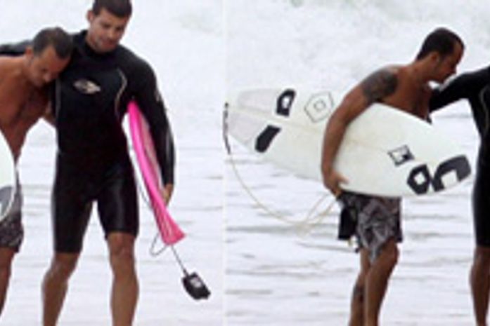 Depois de discutirem por causa de onda na sexta-feira, 26, Cauã Reymond e Paulo Vilhena voltaram a surfar juntos na Prainha, na Zona Oeste do Rio, neste sábado, 27. Provando que a briguinha está no passado, os dois deixaram o mar abraçados e em clima de paz total. Thaila Ayala, namorada de Paulinho, também estava no local e trocou beijos com o galã