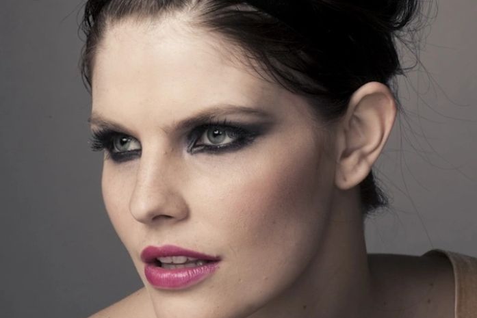 Chegamos aos olhos. Você pode usar uma camada de potencializador de sombras e em seguida aplicar uma sombra escura nas pálpebras, em tons de roxo ou berinjela. Na parte mais interior do olho, entre a linha do côncavo e a raiz das sobrancelhas, aplique uma sombra de cor rosa clara.