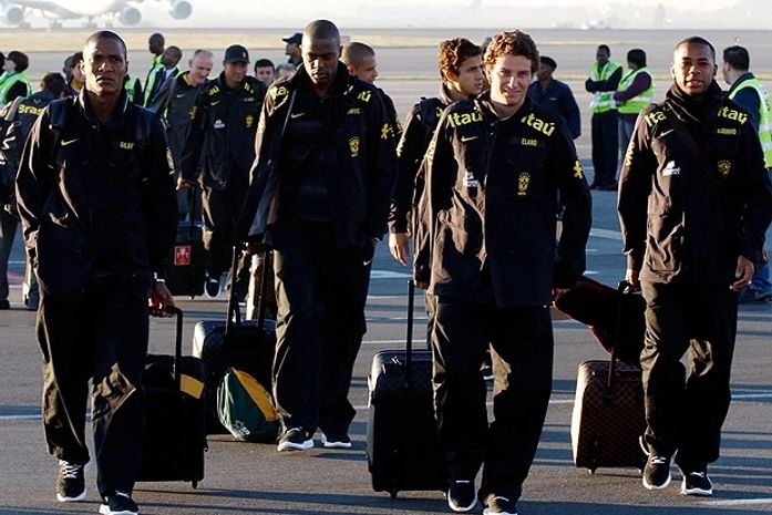 Assim que deixou o avião, o time foi para o ônibus, onde aguardou o zagueiro e capitão Lucio e o lateral-direito Maicon, ambos do Internazionale de Milão. Os dois viajaram direto da Itália para a África do Sul e chegaram cerca de 15 minutos após os companheiros entrarem no veículo, que ainda não é o oficial que a seleção usará durante a Copa, com a frase 'Lotado! O Brasil inteiro está aqui dentro!'.