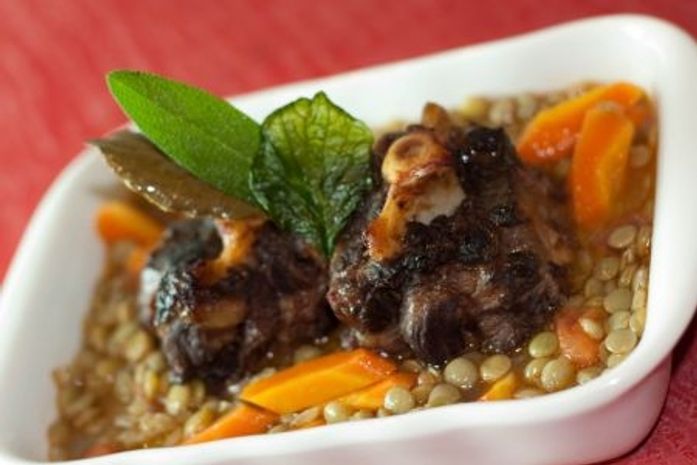 Junte as lentilhas escorridas e refogue por mais alguns minutos. Coloque um pouco de sal, cubra com água fria e deixe cozinhar em fogo brando por cerca de meia hora. Para finalização, numa caçarola funda, refogue o restante do alho e da cebola, junte o tomate picado. Abaixe o fogo e acrescente os legumes da marinada, os pedaços de rabada e as lentilhas já cozidas. Deixe apurar em fogo brando por dez a 15 minutos. Tempere com sal e pimenta, junte a salsinha picada e sirva.