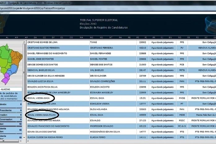 De acordo com registro feito no Tribunal Regional Eleitoral, TRE, o conselheiro aposentado do Tribunal de Contas de Alagoas Edival Vieira Gaia, disputará as eleições pelo Partido do Movimento Democrático Brasileiro, PMDB, como candidato a deputado estadual. Seu filho, deputado estadual Val Gaia participará, também, da disputa pelo Partido da Social Democracia Brasileira, PSDB. Val é candidato a reeleição.