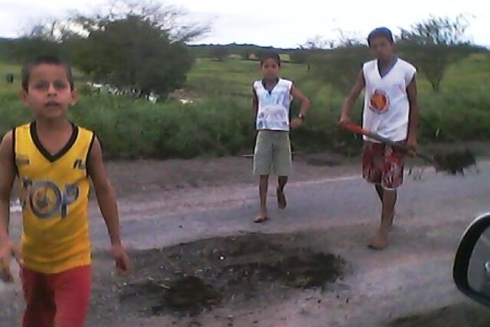 Com as enchentes que destruíram vários municípios e rodovias em Pernambuco e Alagoas, o tráfego de veículos pesados aumentou na BR-423 que cruza o Sertão do Estado. Com isso, a rodovia está danificada e crianças se arriscam para ganhar algum “trocado” tampando buracos.
