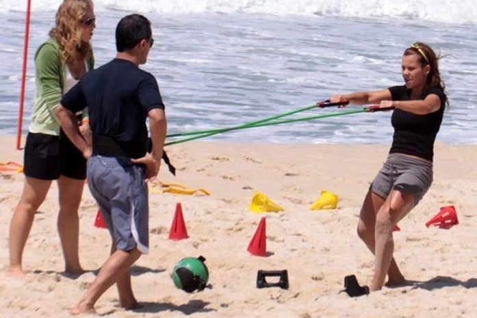 Fernanda Souza gravou um quadro do programa "Estrelas" com Angélica na praia da Reserva, no Rio de Janeiro, na manhã desta quarta, dia 3. Fernanda Souza mostrou seu treinamento para manter a forma.