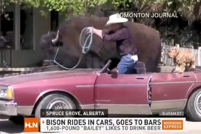 Motoristas já foram flagrados levando cavalos, cabras, bovinos, porcos e outros animais dentro do veículo, mas um canadense se superou e carrega um bisão de estimação chamado "Bailey" em seu veículo conversível. Segundo a reportagem do "Edmonton Journal", o animal de mais de 700 quilos gosta de ir a bares com seu dono para beber cerveja.