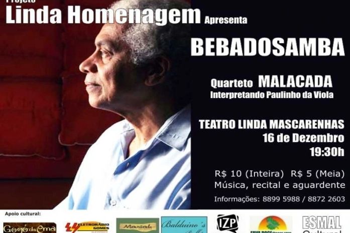 Bebadosamba acontece no dia 16 de dezembro no Teatro Linda Mascarenhas. Os ingressos serão vendidos na Adega do Farol (na rua da Casa Vieira do Farol), no Restaurante Mariah (Rua Cincinato Pinto,137, Centro, próx. ao beco São José) e no local do evento.
