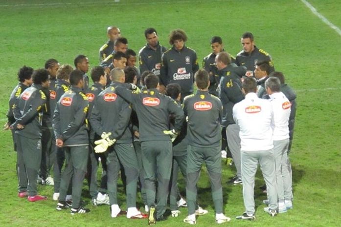 A equipe que o treinador mandou a campo como titular no trabalho tático teve também o goleiro Julio César, que retorna pela primeira vez depois do fracasso brasileiro na Copa do Mundo de 2010. A defesa, por sua vez, continua a mesma do começo da era Mano, Daniel Alves, Thiago Silva, David Luiz e André Santos.