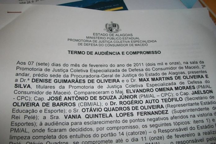 Segundo o termo de audiência e compromisso, a reunião foi realizada para esclarecer pontos negativos aferidos na vistoria da PM/AL, onde ficaram decididos, por compromisso, os seguintes tópicos;