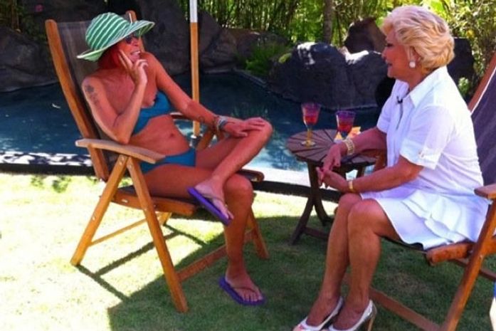 De biquíni, Rita Lee recebe Hebe Camargo em sua casa
