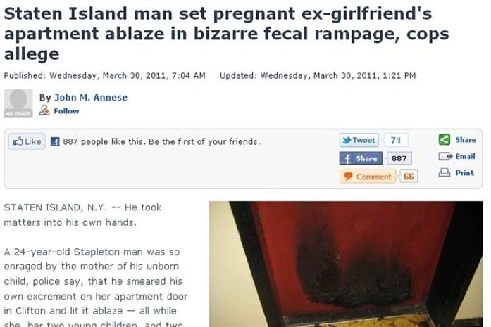 O americano Rasheen Harrison, de 24 anos, foi preso em Staten Island, no estado de Nova York (EUA), depois que usou suas fezes para pichar a porta do apartamento de sua ex-namorada. Em seguida, ele ainda tentou colocar fogo na porta, segundo o site "Staten Island Live".