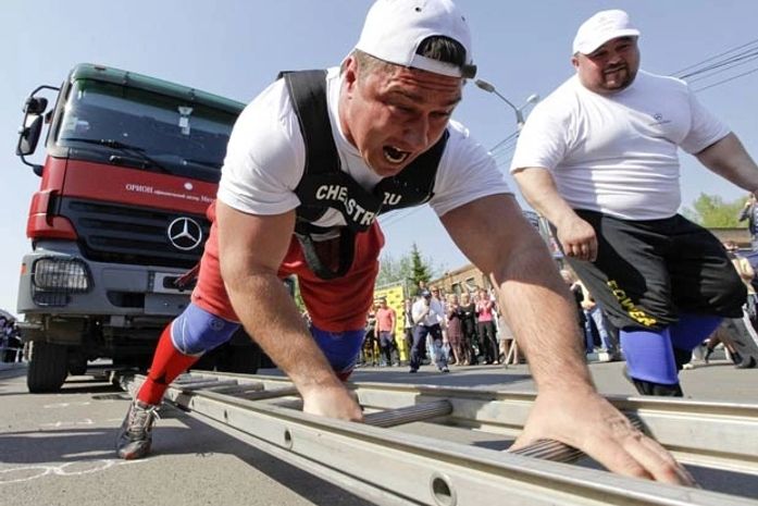 O ucraniano Vladimir Muravlyov puxou dois caminhões que pesavam cerca de 34 toneladas por uma distância de 10 metros durante um evento de força na cidade de Krasnoyarsk, na Rússia. O show foi organizado como parte de uma exposição internacional de automóveis.
