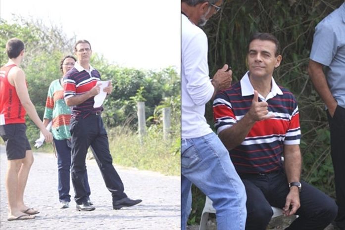 Mário Gomes participou de gravações na praia de nudismo de Abricó, na Zona Oeste do Rio de Janeiro, na manhã desta terça-feira, 9. O ator foi clicado com roupa, apesar de a praia carioca ser conhecida pela prática naturista.