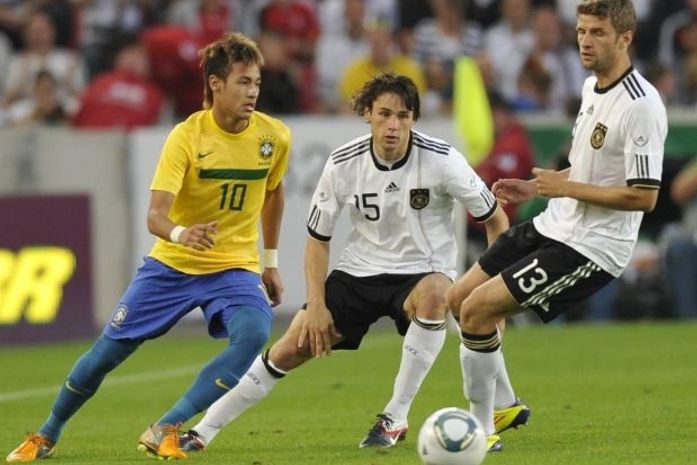 O Brasil tomou sufoco nos primeiros 10 minutos de jogo em Stuttgart. Mano trancou mais o time em relação à Copa América, com Fernandinho fechando o meio de campo pela direita, Ramires pela esquerda e Ralf centralizado. E a Alemanha foi para cima, encurralou o rival e quase abriu o placar aos 4min, quando Götze recebeu no peito livre, ajeitou e chutou para boa defesa de Júlio César.