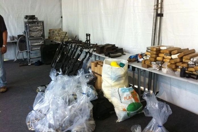 Dentro da estrutura, foram encontradas 14 granadas, quatro fuzis, uma luneta com mira telescópica para fuzil, cinco pistolas, uma faca, cerca de mil munições, três anteparos de cerâmica para colete balístico que suporta tiro de fuzis, 42 carregadores, nove rádios transmissores, 32 carregadores de fuzis, 11 carregadores de pistolas, cinco coletes balísticos, cinco toucas Ninja, três joelheiras e uma quantidade ainda não especificada de cocaína a granel.