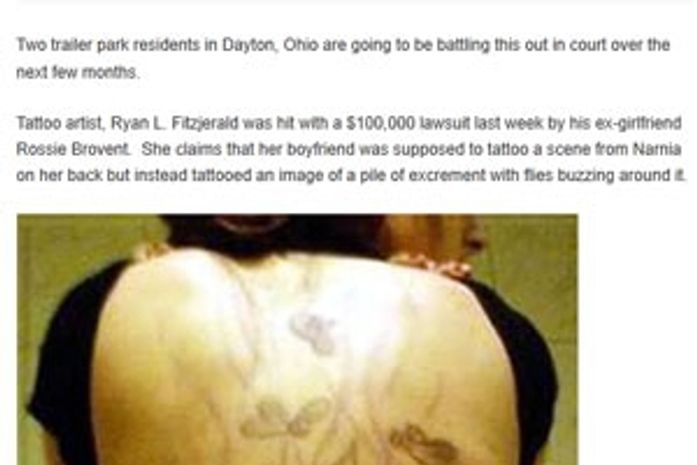 Um tatuador norte-americano de Dayton, Ohio, se vingou da namorada que o estaria traindo fazendo uma enorme tatuagem em suas costas com a imagem de fezes com moscas voando em volta, segundo o site "Very Weird News".