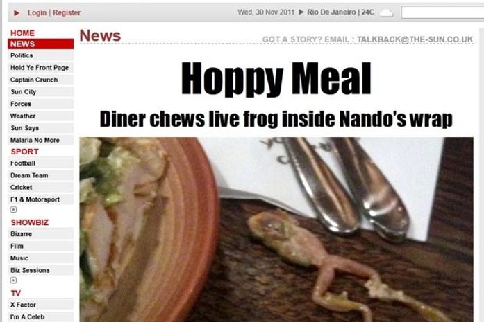 O britânico Ross Dance, de 32 anos, encontrou um sapo vivo em um sanduíche de frango. Ele diz ter conseguido cuspir o animal de 10 centímetros fora, mas teme que possa ter comido uma de suas pernas, segundo reportagem do jornal inglês "The Sun".