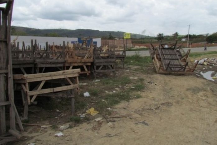 Bancas que são usadas para a comercialização de mercadorias na feira livre do bairro Roberto Correia de Araújo, popular Terrenos, são armazenadas a céu aberto às margens da BR-104, na Rua Maria Carmelita e servem segundo informações, como banheiro para animais e pessoas que trafegam pelo local.