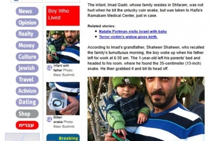 Um bebê de 1 ano matou uma cobra de 35 centímetros após arrancar com uma mordida a cabeça do réptil na última quinta-feira em Shfaram, em Israel. A criança Imad Gadir não ficou ferida, mas foi levada para o hospital por precaução, segundo o jornal "Yedioth Ahronoth".