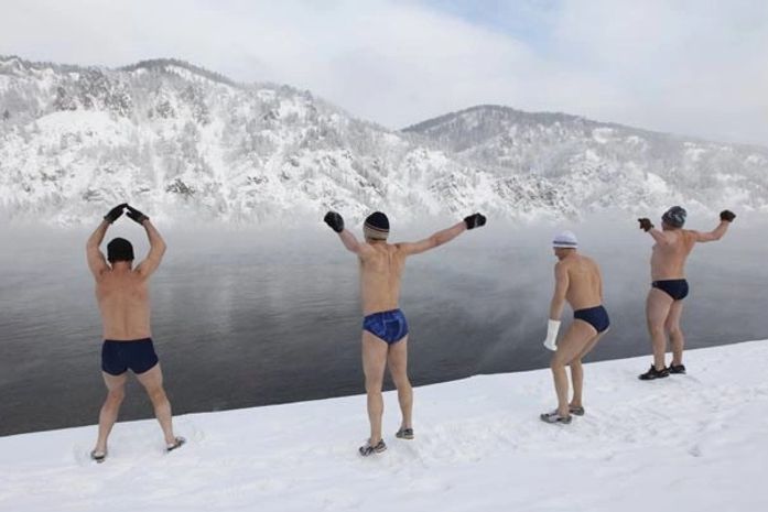 De sunga, membros de um clube de natação encararam nesta sexta-feira (3) as águas geladas do rio Yenisei, em Divnogorsk, a 38 km da cidade siberiana de Krasnoyarsk, na Rússia. No momento, a temperatura ambiente estava em menos 25º C.