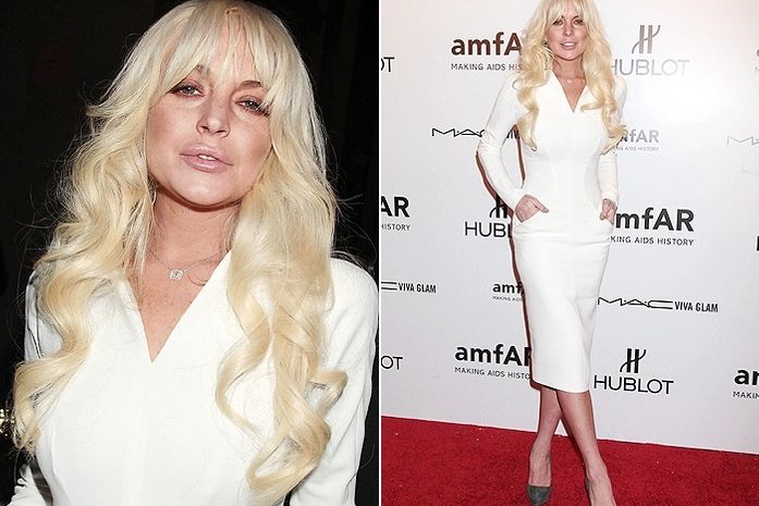 LiLo estava com um vestido branco e o cabelo loiríssimo todo cacheado e com uma longa franja que cobria seus olhos.