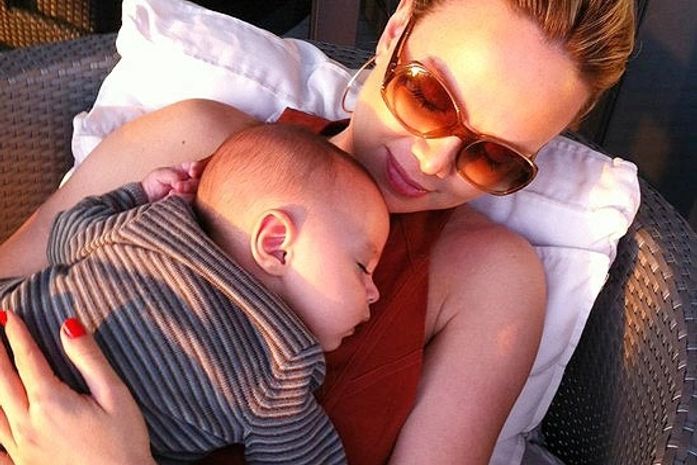O pequeno, que completa 6 meses hoje, aparece dormindo no colo da apresentadora.