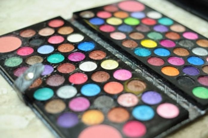 Escolha três cores de sombra para a maquiagem dos olhos. Neste caso, escolhemos turquesa, azul escuro e verde claro. Com o rosto já limpo e preparado com base e corretivo, aplique a sombra de cor intermediária (escolhemos o turquesa) sobre as pálpebras.