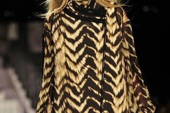 Roberto Cavalli misturou tecidos pesados e leves. Os casacos eram de lã grossa, em contraste com os vestidos levíssimos.