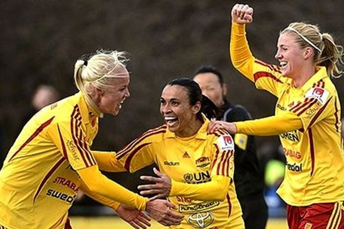 Já se passavam 55 minutos, a partida estava ganha mas a festa ainda não era completa no Tyresövallen. Faltava o gol de Marta. E quando ele saiu foi um golaço, de calcanhar, o quinto do Tyresö na goleada de 7 a 0 sobre o KIF Örebro na estreia no Damallsvenskan, o Campeonato Sueco feminino. O sexto também foi dela e nas duas vezes a comemoração foi ao som de "Ai, se eu te pego" nos alto-falantes do estádio.