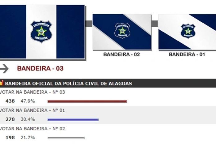 A Polícia Civil de Alagoas conclui hoje, 02, a votação para a escolha da primeira bandeira oficial da Instituição. A escolha foi feita por meio da participação de internautas e foi superior a 900 votos.