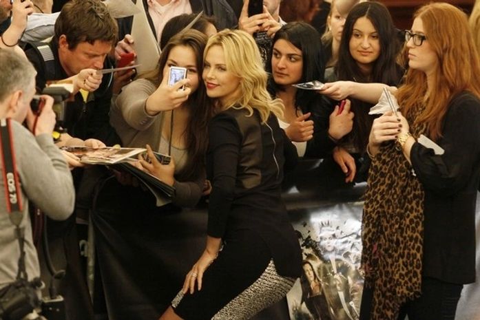 Simpática, Charlize Theron posou para fotos com fãs em Berlim, na Alemanha. Nesta quarta-feira, 16, a atriz e Kristen Stewart participaram de evento para promover o filme “Snow White and the Huntsman”.