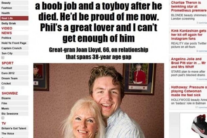 A vovó britânica Joan Lloyd , de 66 anos, realizou o último desejo de seu falecido marido, David, ao colocar silicone nos seios. De quebra, ela ainda encontrou uma namorado 38 anos mais novo do que ela, segundo o jornal inglês "The Sun".