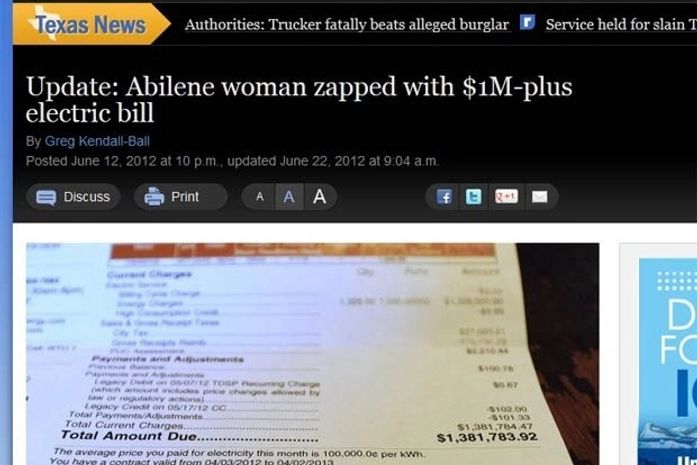 A americana Kristin Harriger recebeu uma conta de luz de US$ 1,38 milhão (mais de R$ 2,8 milhões) em Abilene, no estado do Texas (EUA), segundo o jornal "Reporter-News