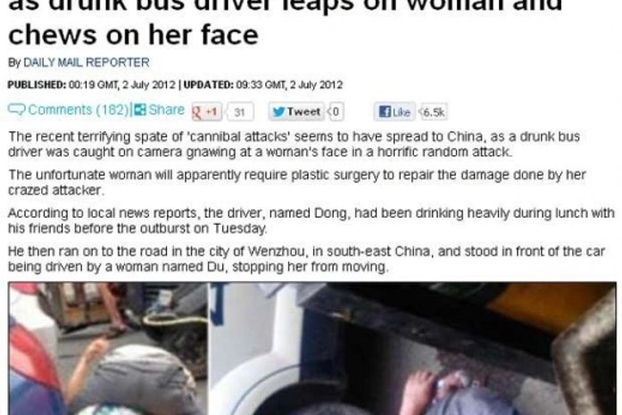 Uma mulher foi hospitalizada na China após um motorista de ônibus bêbado atacá-la e começar a comer partes do rosto dela, informa o tabloide britânico Daily Mail.