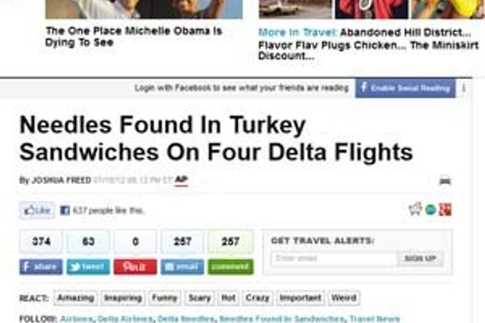A companhia aérea Delta Airlines está tentando descobrir como agulhas foram parar dentro de sanduíches em quatro de seus voos de Amsterdã, na Holanda, para os Estados Unidos.