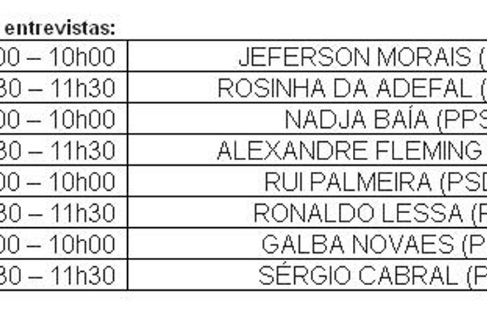 A entrevistas acontecerão entre os dias 06 e 09 de agosto, no auditório do Sesc Poço. Serão entrevistados dois candidatos por dia, sendo o primeiro das 09h00 às 10h00 e o segundo das 10h30 às 11h30. Pelo sorteio, o candidato Jeferson Morais (DEM) será o primeiro a ser entrevistado, no dia 06, primeiro horário. No mesmo dia, no segundo horário, será a vez de Rosinha da Adefal (PTdoB). Já a candidata Nadja Baía (PPS) abre as entrevistas do dia 07, seguida de Alexandre Fleming (PSOL). No terceiro dia de entrevistas, dia 08, as sabatinas ocorrerão com Rui Palmeira (PSDB) e Ronaldo Lessa (PDT). No último dia (09/08) serão entrevistados Galba Novaes (PRB) e Sérgio Cabral (PPL).