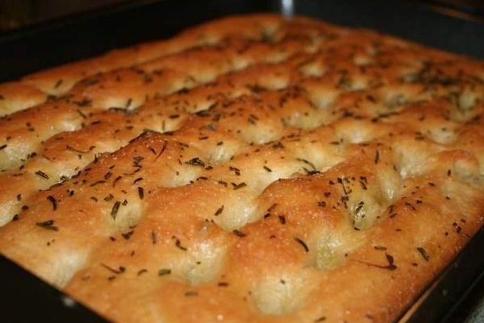 Divida a massa em duas partes. Deixe descansar a massa numa bacia com azeite por 20 minutos. Abra a massa numa assadeira bem untada com azeite. Faça a cobertura com o azeite, sal grosso e alecrim. Deixe fermentar até dobrar de volume e asse a 180ºC por cerca de 25 minutos.