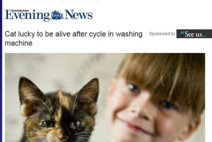 A gatinha chamada "Tinker" escapou após ficar presa em uma máquina de lavar roupa em Mayfield, Midlothian, no Reino Unido, segundo o jornal "Edimburgh Evening News".