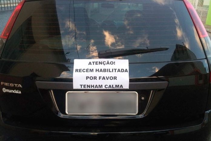 Muitas pessoas ficam tensas e apavoradas só de pensar em dirigir. Outras até dirigem, mas não em todas as situações. E foi justamente este medo, comum a tantos motoristas (recém-habilitados ou não), que levou a vendedora Isabella Prado Petri, de 19 anos, moradora de Piracaia, no interior de São Paulo, a tomar uma medida inusitada: avisar sua inexperiência ao volante com uma placa colada no vidro traseiro do carro.