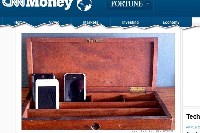 O restaurante Eva, em Los Angeles (EUA), passou a oferecer um desconto de 5% na conta para clientes que deixem o telefone com a recepcionista durante a refeição, de acordo com informações da rede americana CNN. Conforme a publicação, a nova política entrou em vigor a cerca de um mês.