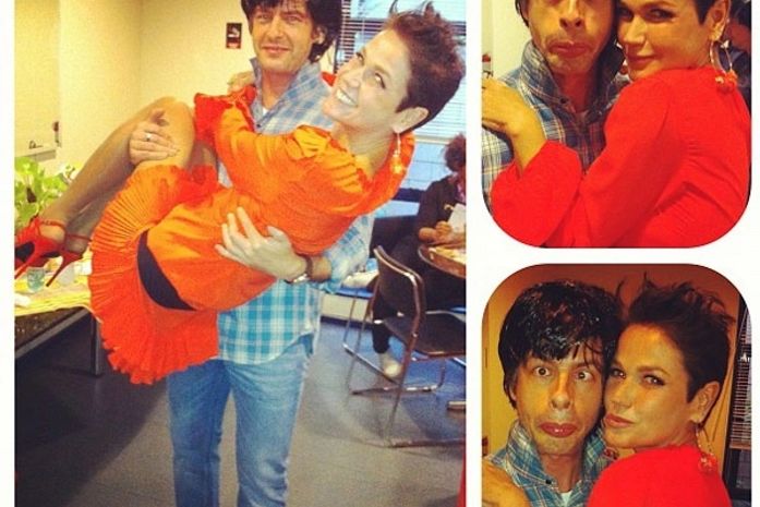 Depois de publicar alguns cliques ao lado de Alexandre Pires e Victor & Leo em seu camarim, a eterna Rainha dos Baixinhos divulgou novas fotos do local. O sertanejo Victor entrou no clima do novo look da rainha e colocou uma peruca morena. Os dois fizeram graça para a câmera e o cantor, que já foi tido como affair de Xuxa, chegou a carregar a amiga nos braços.