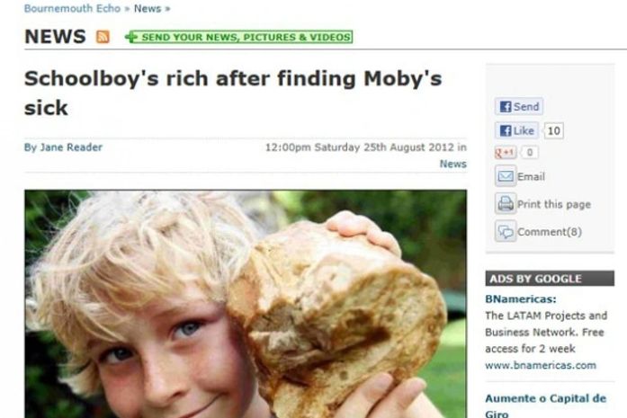O estudante britânico Charlie Naysmith, de oito anos, encontrou um vômito de uma baleia em uma praia de Hengistbury Head, perto de Bournemouth, no Reino Unido, que pode valer a quantia de 40 mil libras (R$ 128 mil), segundo o jornal "Daily Echo".