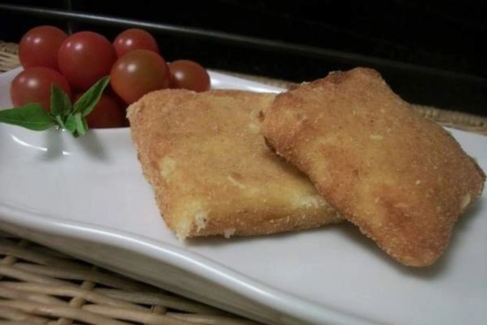 Passar as fatias de mussarela duas vezes pelo ovo batido e pela farinha de rosca