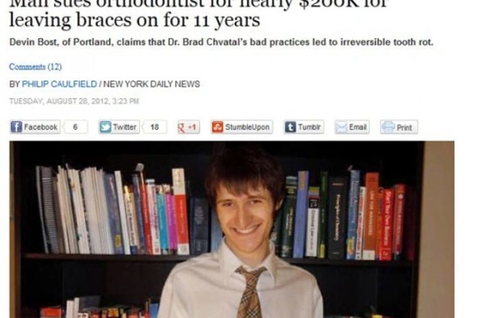O americano Devin Bost, de 22 anos, entrou com um processo contra o ortodontista Brad Chvatal no estado do Oregon (EUA), pedindo uma indenização de US$ 185.100 por ter sido obrigado a usar aparelho odontológico por 11 anos, segundo o jornal "New York Daily News".