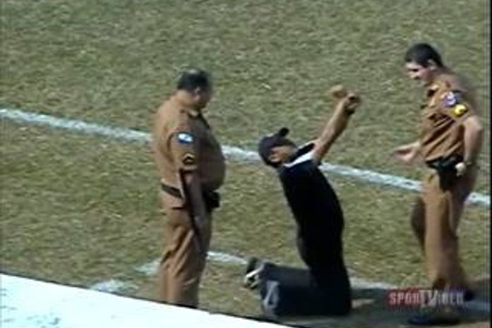 Técnico reclamar e ser expulso é até fato comum no futebol brasileiro. Agora, treinador ser mandado para o vestiário pelo árbitro e implorar para ser algemado por um policial militar é raro.
