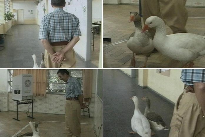 "Os gansos vão comigo a todo o lugar. Tinha até esquecido deles ao sair de casa, mas voltei e peguei. Se vão comigo a todo o lugar, tinham de vir votar, né?", disse o militar aposentado. Adão, Kiko e Frida são figuras conhecidas na cidade. Segundo os moradores, é normal vê-los caminhar no centro. Ir ao banco. Ao supermercado. Sempre, claro, chamando a atenção.