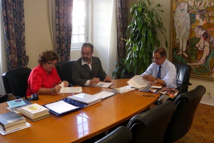 Em visita de estudos de pós-doutoramento na cidade de Lisboa – Portugal, os Diretores da Faculdade de Tecnologia de Alagoas - FAT, Prof. Dr. Mario Cesar Jucá e a Profa. Dra. Maria de Fátima da Costa Lippo Acioli oportunizaram a assinatura de convênio com Universidade Portuguesa, na foto representada pelo Presidente do Conselho de Administração - Manuel de Almeida Damásio, a fim de criar possibilidades para a formaçao de novos mestres e doutores que possam contribuir com a Educação do Estado de Alagoas.