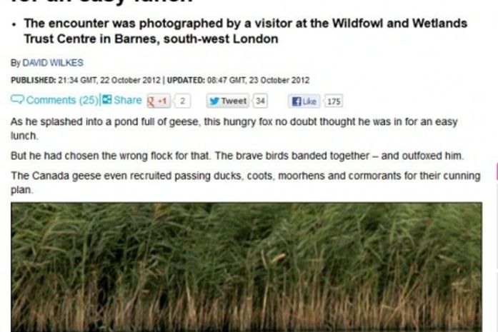 Uma raposa faminta pensou que teria um almoço fácil ao entrar em uma lagoa em Barnes, no Reino Unido, mas seu deu mal. Os gansos e outras aves se uniram e encurralaram o predador. A raposa acabou desistindo e saiu da lagoa, segundo o jornal inglês "Daily Mail".