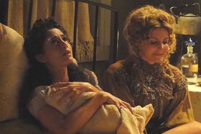 Isabel cede e aspira o produto, ficando completamente zonza. Nesse momento, a tecedeira dos anjos, dona Dionísia (Ady Salgado), entra. “Quem é ela?”, pergunta Diva. “Uma vizinha, que é rezadeira. É pra Deus ajudar”, mente a parteira