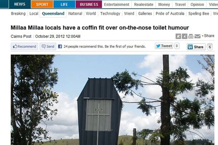 A cidade de Millaa Millaa, na Austrália, construiu um banheiro no formato de caixão no cemitério local, segundo o jornal "Courier Mail".
