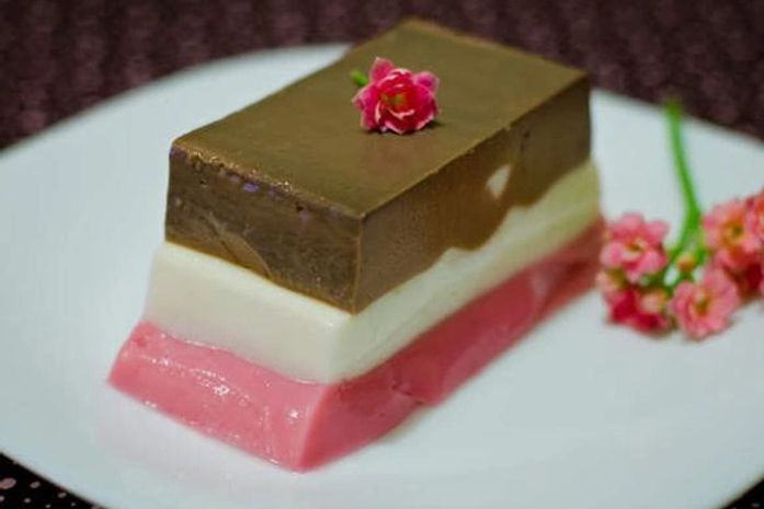 Dissolva a gelatina conforme a indicação da embalagem. Ferva um pouco de água e coloque a gelatina em banho maria (fora do fogo) para que não endureça, pois ela será usada em três momentos diferentes. Caso ela endureça antes de terminar a receita, é só levá-la, em banho maria, agora no fogo, até que a gelatina esteja dissolvida.