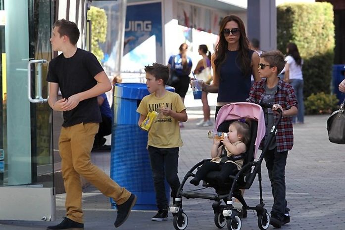 De acordo com o "Daily Mail", não é a toa que Victoria adora salto alto. A estilista já foi ultrapassada pelo filho mais velho, Brooklyn, de apenas 13 anos de idade. No passeio em família, é possível ver o garoto já mais alto que a mãe. Fofa, Harper aproveitou todo o dia em um carrinho de bebê ou no colo dos irmãos. Na saída, a garotinha tomou suco em uma mamadeira.